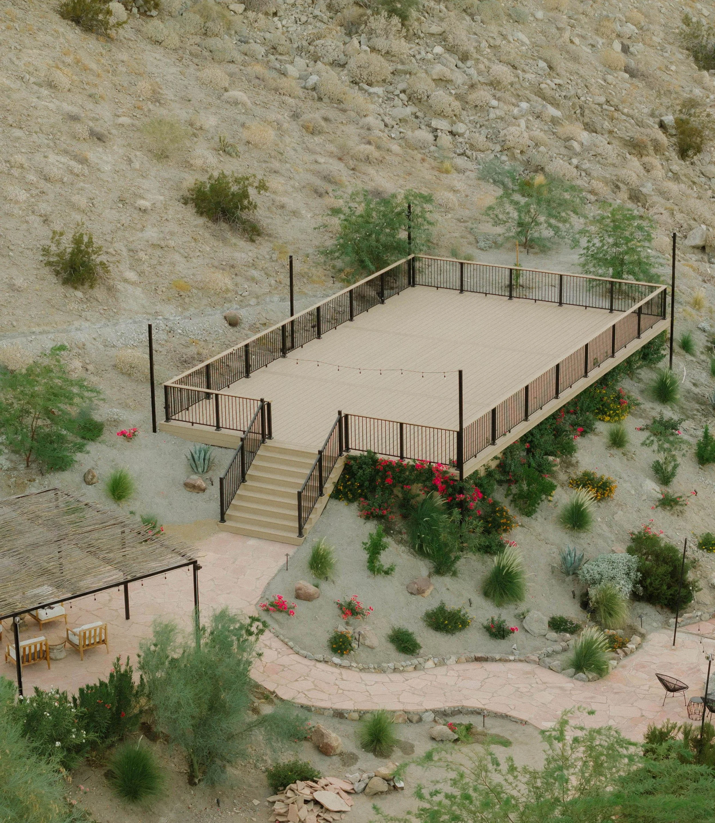 Both the ceremony and reception will be held outdoors. While it’ll be warm during the day, the desert cools down at night.